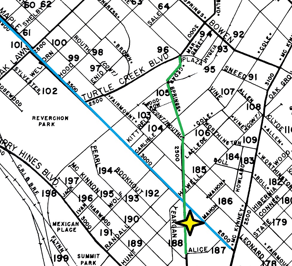 Things apparently continued fairly well until 1920 when the company began to experience tensions with its residential neighbors. Early in the year, city building inspectors responded to nuisance complaints and ordered the company to move its horse stables as they were too close to adjoining residences (ice delivery even into the 1940s and possibly 1950s was often done via horse-drawn wagons). Later the same year, still-unhappy neighbors filed suit to “force the company to remove its plant from the thickly settled residence district” (DMN, Dec. 1, 1920). The ice company appears to have won the lawsuit, since the company (under various names) was at 3307 Lemmon until at least 1939 or ’40, but these problems might have led them to build a new plant at Cole and what is now Monticello in 1922 (as with the Lemmon location, this new plant was also built alongside the MKT tracks). The mere prospect of this new icehouse was met with loud protests by the new neighborhood — before construction even began — but a judge ruled in favor of the ice people. Construction went ahead, and the plant was a neighborhood fixture for many years. (See the location on a 1921 Sanborn map here; “Gertrude” — near the top edge — was the original name of Monticello Avenue.)