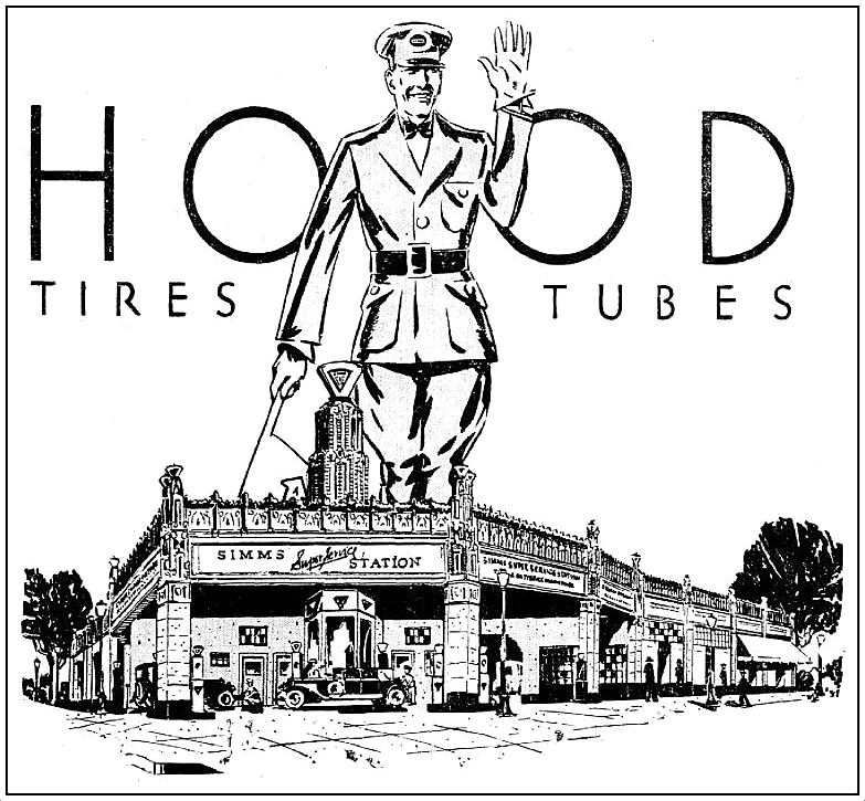 Here are a couple of later photos of the building, post-Simms. The first one is from a grainy Shook Tires ad from 1938. The color postcard is from the 1960s when it was the C. S. Hamilton Chrysler dealership. The beacon is still there but, surely, it was no longer beaconing (unlike the Republic Bank “rocket” seen in the background, which was beaconing big-time). (See below in the comments for a 1940s photo of the building.)