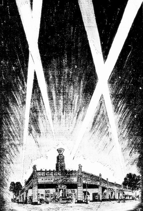 The building is of terra cotta in modernistic design with the well-known Simms color scheme of blue, white and red used. […] On top of the structure is a beacon bearing the Simms triangle. It will revolve with flood lights playing on it all the while. (DMN, April 27, 1930)