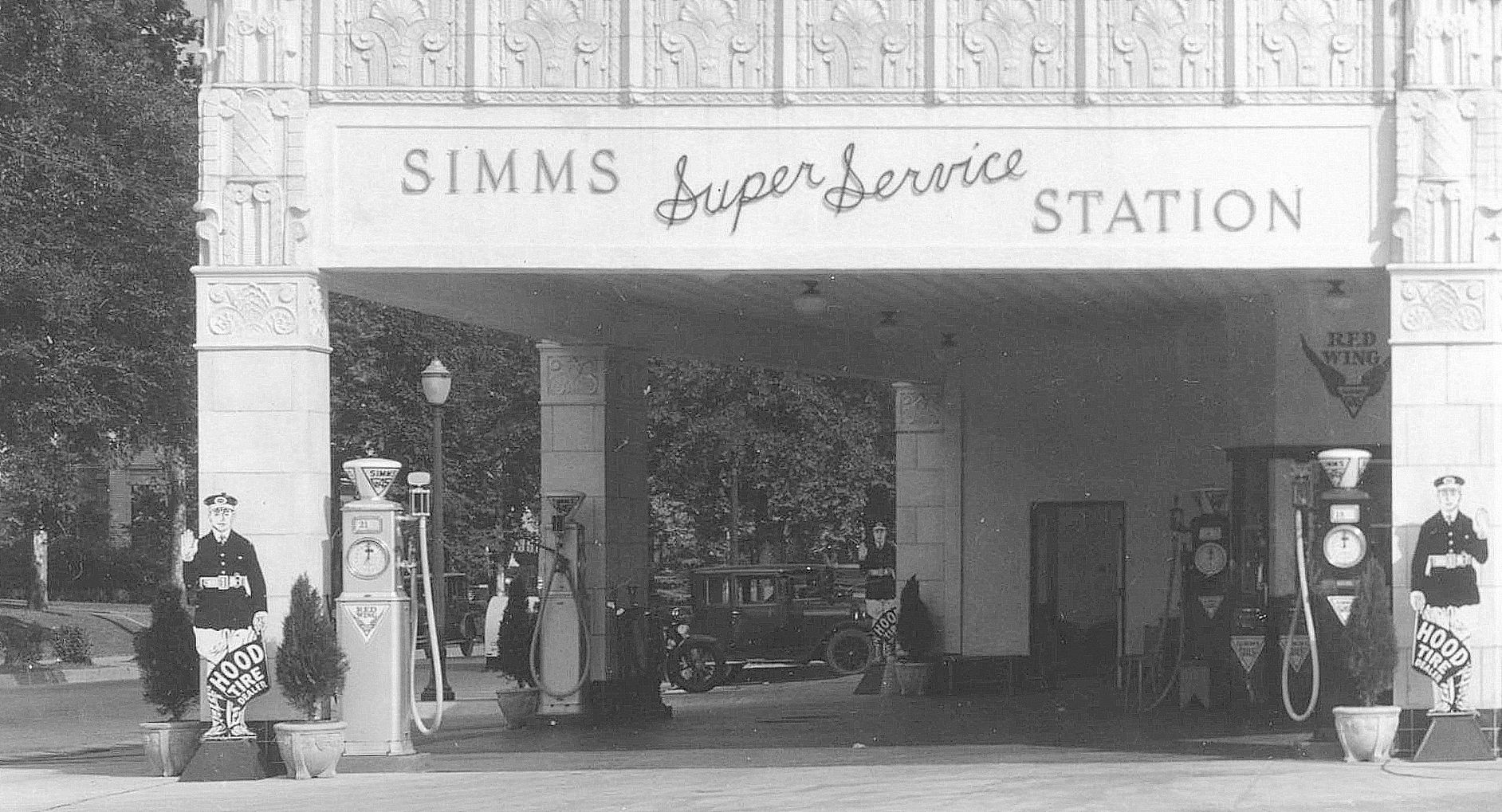 Construction of the station and attached retail spaces was announced in 1929 by the Dallas-based Simms Oil Company (headquartered in the Magnolia Building, with a refinery on Eagle Ford Road in West Dallas) — it was reported that the impressive building would cost about $40,000 (about $615,000 in today’s money). It would be the 34th Simms service station in the city but it would be the first SUPER service station. Its grand opening at the end of April, 1930 was a big event, broadcast over KRLD radio, with singers, music, and flowers for the ladies. No business was conducted during the grand opening — it was strictly an open house, offering prospective customers the opportunity to walk among the gas pumps and admire what the company called “the last word in service station art.”