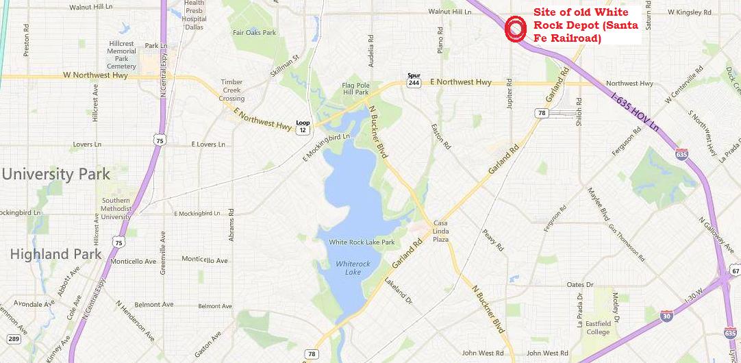 Photo of the Texas Chief pulling out of the White Rock Station was taken by Everette L. DeGolyer on Dec. 29, 1956; it is from the Everette L. DeGolyer Jr. Collection of United States Railroad Photographs, DeGolyer Library, Central University Libraries, Southern Methodist University. The photo (“Atchison, Topeka, and Santa Fe, Diesel Electric Passenger Locomotive No. 11, White Rock Station”) can be viewed here.