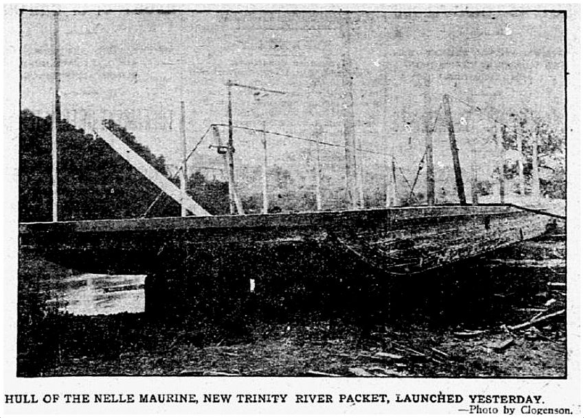 The Nelle Maurine is a model bow, flat-bottomed boat, seventy feet in length, sixteen-foot beam on the water line, and twenty feet including the guard rail. She is a propeller boat, draws twelve inches of water, and is driven by a 40-horsepower engine. In the event it be found that the engine is not of sufficient power to give the boat the required speed, it is so arranged that it can be changed to 80-horsepower with but very little trouble. With full cargo aboard, the vessel will require a depth of about thirty-three inches of water. (Dallas Morning News, Sept. 29, 1906)