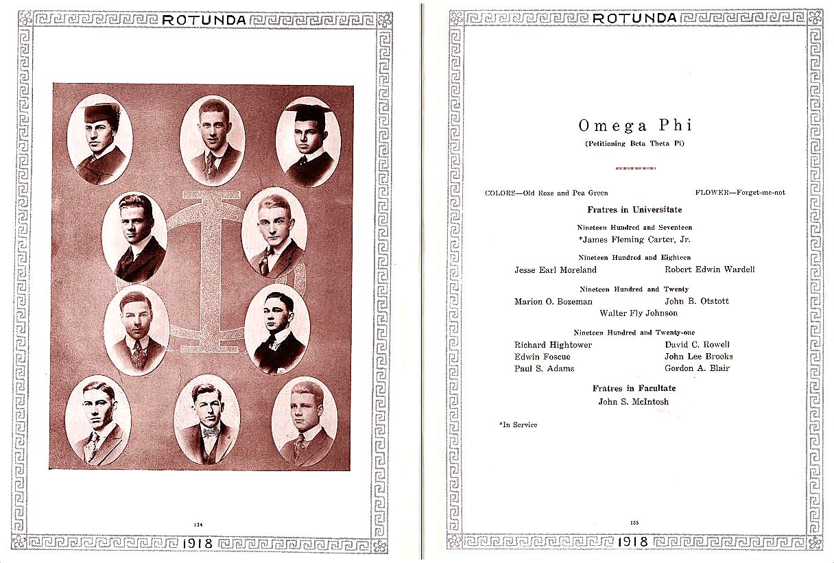 The top photo had “1917” written on the back, so I checked SMU’s Rotunda yearbooks from around that time. Here’s a look at the men who were members of Omega Phi in 1918. Several of these faces match the ones in the photos of the afternoon outing.