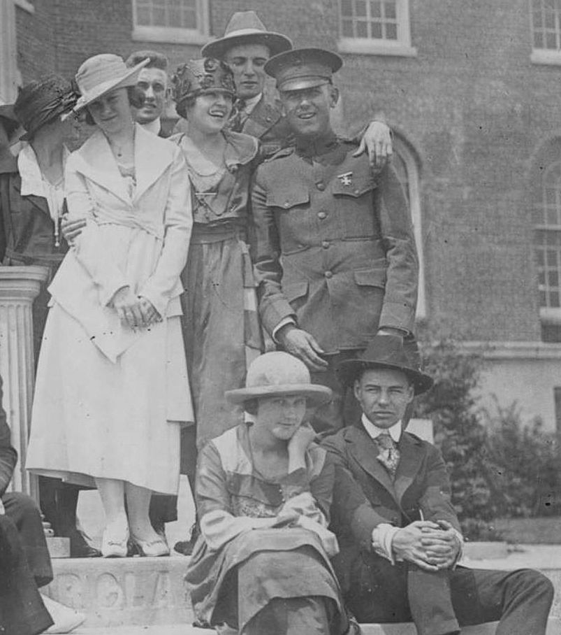 These three photographs show a group of ten young couples and a pair of chaperones spending a beautiful sunny day together, with the highlight of the day being a trip to Highland Park’s Exall Lake. The men are SMU students, identified only as members of the Omega Phi fraternity. The women are identified merely as “dates,” but I’m sure that some of them were also SMU students. The photograph above shows the crowd gathered on campus in front of Dallas Hall. The woman in white looks like she’s on a pedestal, glowing in a spotlight. Below, a closer look at her stylish outfit (as well as a look at the young be-medaled WWI soldier next to her).