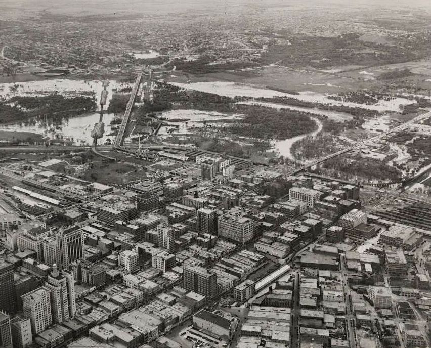 When the Great Flood of 1908 hit on May 25, there was absolute bedlam, beginning in the middle of the night when one man set off several “dynamite bombs” one after another in order to awaken his neighbors who were unaware of the sudden and unexpected rise of the swollen river and who were in imminent danger. When Dallasites went to bed on May 24, the river was at an already high 28 feet. By 3:00 in the morning, just a few short hours later, it had risen to an incredible — and incredibly dangerous — 41.5 feet. By that afternoon it was over 51 feet, and by nightfall, it had surpassed all records and was at more than 52 feet. West Dallas and downtown were underneath water. Homes and livestock were washed away. Electricity was out. Telephones were out. Roads and railways were impassable. There was absolute panic.