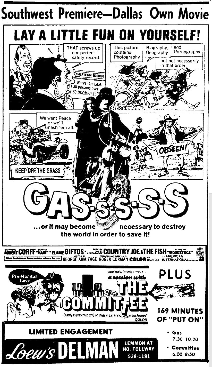 Lastly, I’ve added a few articles and images to the 2014 post “Roger Corman Does Dallas,” about a painfully groovy, super-low-budget, anti-establishment movie, a few scenes of which were filmed in downtown Dallas and on the SMU campus in 1969. The official movie title is complicated and irritatingly punctuated — let’s just call it “Gas” to make things easier. Here’s one of the things I’ve added to the original post, a 1970 ad from the SMU campus newspaper (click to see a larger image). (Source: SMU Daily Campus, Nov. 4, 1970, Student Newspapers collection, DeGolyer Library, Southern Methodist University)