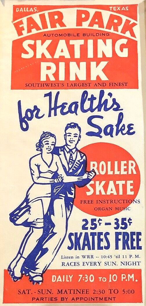 Below, a charming ad for the skating rink at Fair Park. It has been added to the charming 2014 post “Skate Date!” (“charming” if you skim over the prostitution bits). (Source: eBay)